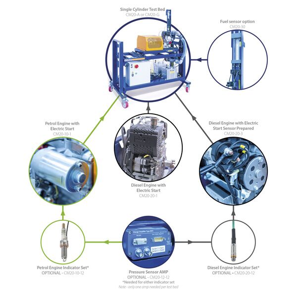 The Armfield CM20 is a self-contained integrated, single-cylinder engine, dynamometer and instrumentation system, based on a range of gasoline and diesel industrial engines.