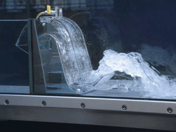 - Each flume incorporates a discharge tank fitted with an adjustable overshot weir and draught tube to avoid splashing and noise