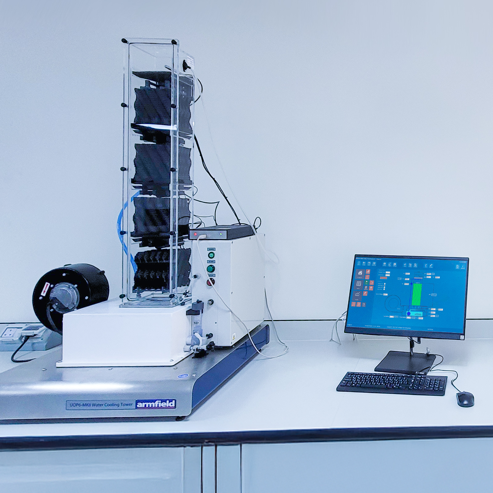 The Armfield Computer Controlled Water Cooling Tower has been designed to give students an appreciation of the construction, design and operational characteristics of a modern evaporative cooling system. The unit is also an excellent example of a specialized heat exchanger, where two streams of fluid flow (water and air) are brought into direct contact and in which there is a mass transfer from one phase to the other
