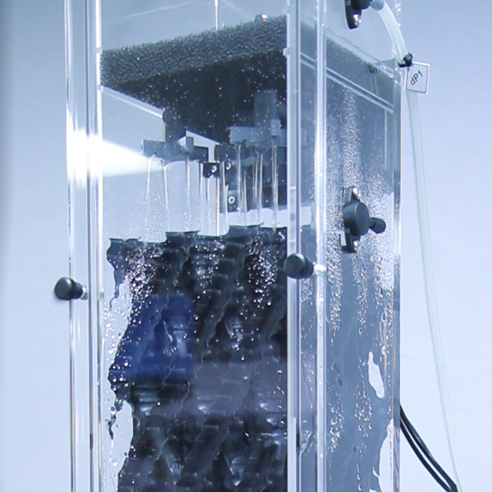 Water is pumped from the reservoir to the top of the tower using a variable speed pump. An array of spray nozzles ensures an even distribution of the water throughout the column section.