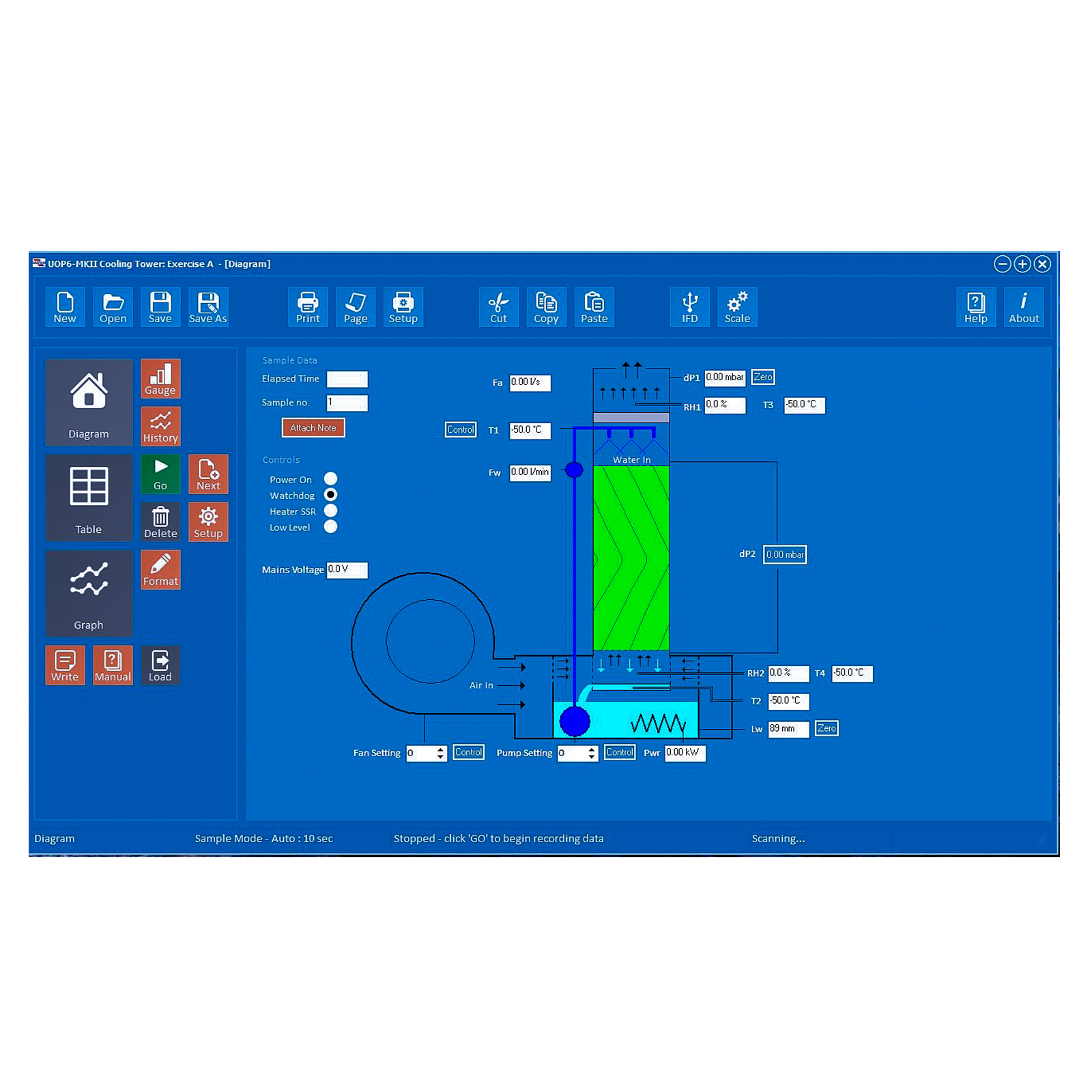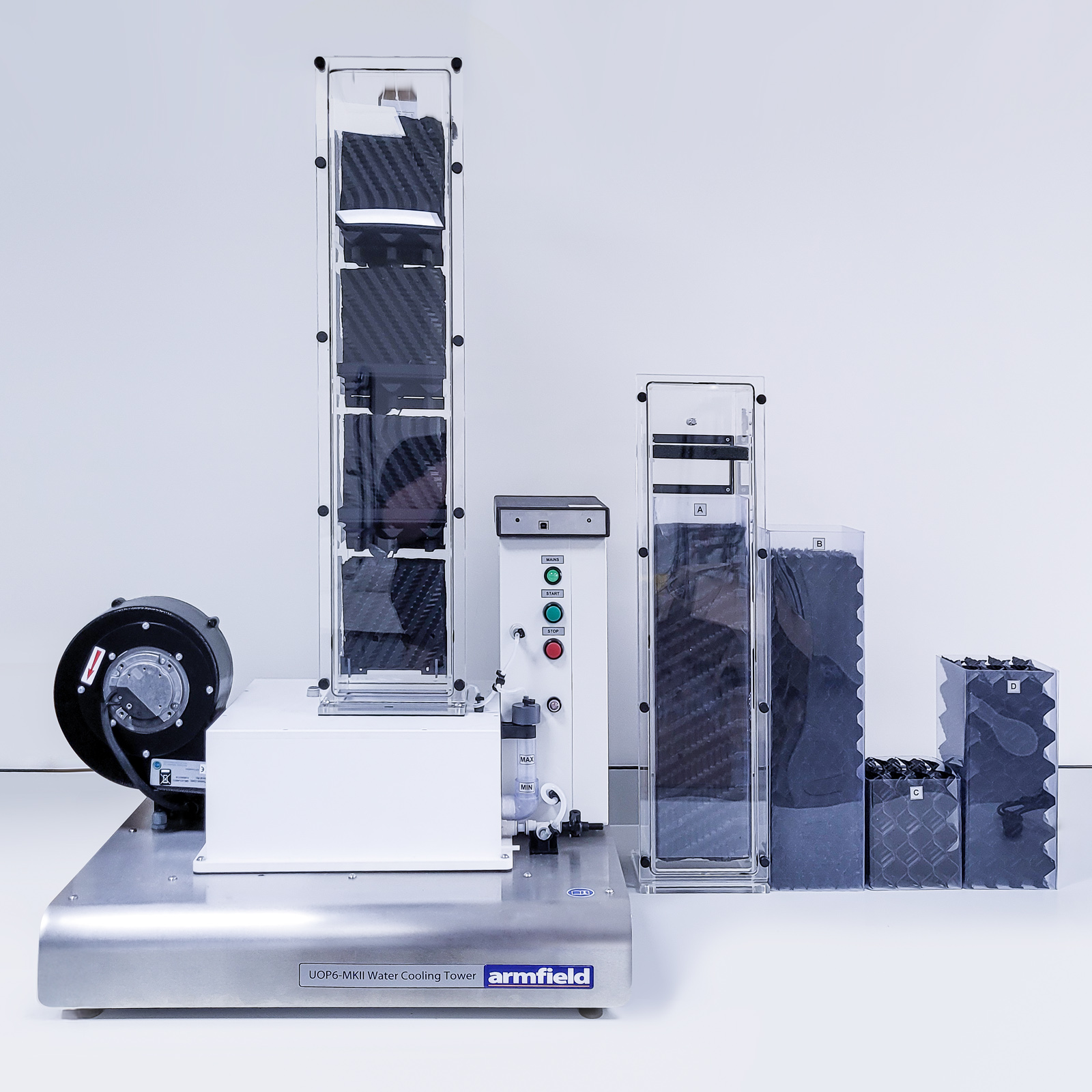 The UOP6-MkII comprises a cooling tower mounted on top of a heated water reservoir. The cooling tower is manufactured from clear acrylic for visibility, and has an easily removable front face to allow different packing materials to be inserted.